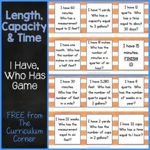 FREE Length, TIme & Capacity Game – I Have, Who Has Activity FREEBIE from The Curriculum Corner 3rd grade math