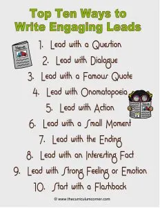 Writing Engaging Leads Anchor Chart – Newspapers in the Classroom Part 4: Writing Feature Articles Free from The Curriculum Corner