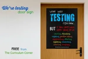 FREE Growth Mindset Themed Testing Sign from The Curriculum Corner | We’re Testing | Chalkboard Themed | Black & White Version FREEBIE