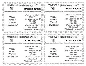 Tools for Close Reading: Identifying thick or thin questions anchor chart by The Curriculum Corner – mini version for reading notebooks in black and white or color